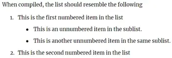 LaTeX list - Enumerate and Itemize - LaTeX-Tutorial.com For unordered lists, LaTeX provides the itemize environment and for ordered lists there is the enumerate environment. The elements within both environments have to be declared beginning with the \item command. The following code examples show how to use the most common types of lists you're going to use in your document.