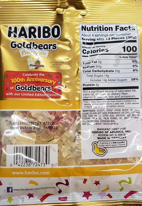 Haribo Gummi Candy, Goldbears, 2 Ounce (Pack of 24) About this item. Package of 24 2 oz. bags. Contains five fruity flavors: Lemon (yellow), Orange (orange), Pineapple (white), Raspberry (red), Strawberry (green) Perfect for on-the-go snacking or sharing with friends. Enjoy America's #1 Selling Gummi Bear. New (3) from $34.98 & FREE Shipping.
