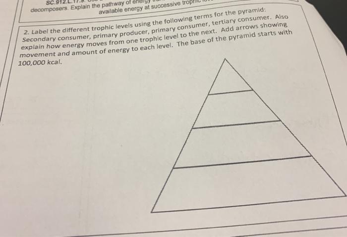 PDF Ecosystems and Energy Flow Project 7. In the space below, construct an ecological pyramid for your ecosystem. Include at least nine organisms in your energy pyramid. Label each level of the pyramid with the correct trophic level. Label each level of the pyramid with the correct type of producer or consumer. Assume the lowest level of the pyramid has 100,000 units of energy.
