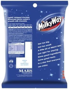 Save on Milky Way Candy Bar Order Online Delivery | Stop & Shop Full-size Milky Way Candy Bars are great for keeping in your desk to brighten your afternoon. Treat yourself to a delicious, delightful chocolate experience. Single Size Milky Way Milk Chocolate Per pack: 240 Calories. 6g Sat fat, 30% DV. 70mg Sodium, 3% DV. 32g Total sugars. We value your Questions or Comments, Call 1-800-551-9985.