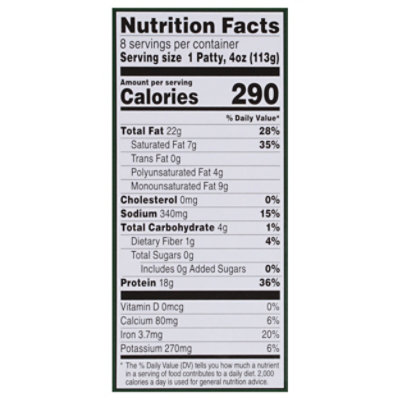 Beyond Meat, Beyond Burger, Plant-Based Patties, 2 Count, Net wt. 8 Oz See nutrition panel for fat, sat fat and sodium content. BETTER-FOR-YOU: each serving has 35% less saturated fat than 80/20 ground beef and no cholesterol ; LESS IS MORE: made with simple, plant-based ingredients with no GMOs, soy or gluten. All of Beyond Meat products are vegan, kosher and have no antibiotics or hormones