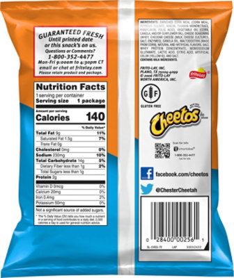 CHEETOS ® Simply Puffs White Cheddar Cheese Flavored Snacks However, we recommend that you check the label on a specific product for the most current and accurate nutritional information. If you need assistance, please contact Consumer Relations toll-free at 1-800-352-4477 Monday through Friday between 9:00 a.m. and 4:30 p.m. Central Standard Time. CHEETOS® Bolitas™ | Cheetos However, we recommend that you check the label on a specific product for the most current and accurate nutritional information. If you need assistance, please contact Consumer Relations toll-free at 1-800-352-4477 Monday through Friday between 9:00 a.m. and 4:30 p.m. Central Standard Time. Cheetos Cheese Puffs Macro Nutrition Facts [Food Label Data] Keto & Health Insights for Cheetos Cheese Puffs. Net Carbs are 9% of calories per serving, at 17g per serving.This meal falls within the range for standard keto diet guidelines (at or under 25g of net carbs). If your daily net carb quota is 25g and if this food almost equals that much, consider whether you're going to eat more food later.