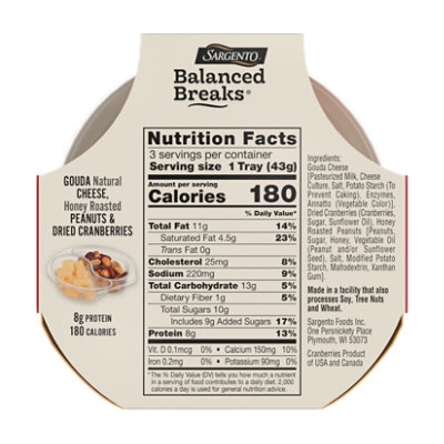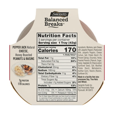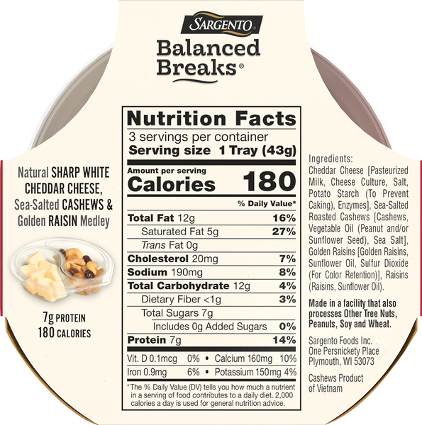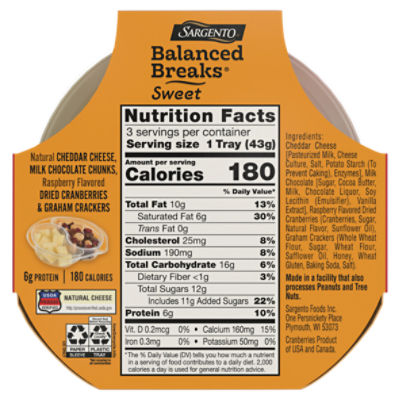 Sargento Balanced Breaks: calories, nutrition analysis & more ... Nutrition Serving Size: 1 Tray (43g) Amount per Serving My Daily Value Calories 180 Kcal 11% Total Fat 12 g 19% Saturated Fat 5 g 29% Trans Fat 0 g 0% Cholesterol 20 mg 7% Sodium 190 mg 8% Potassium 150 mg 3% Total Carbohydrate 12 g 5% Dietary Fiber 0 g 0% Sugars 7 g 10% Added Sugars 0 g 0% Protein 7 g 15% Calcium 130 mg 13% Iron 1.08 mg 6%