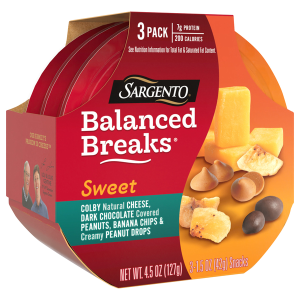 Balanced Breaks® | Sargento Balanced Breaks® | Sargento Balanced Breaks ® UP TO 8 GRAMS OF PROTEIN. LESS THAN 200 CALORIES. * See Nutrition Information For Total Fat And Saturated Fat Content. Not a low calorie food. Balanced Breaks ® Creamy natural cheese pieces carefully paired with crunchy roasted nuts and sweet dried fruits.
